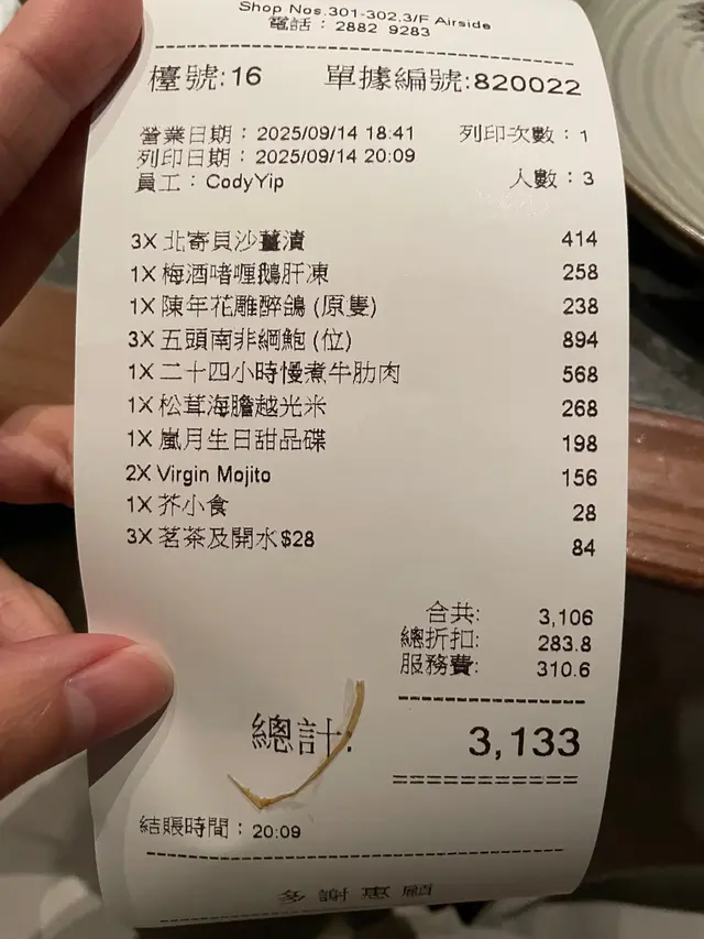 當日用信用卡有九折,所以最後埋單就大約$3100 ,雖然價錢少貴,但係我覺得如果係為咗特定日子慶祝,其實係值得去嘅。