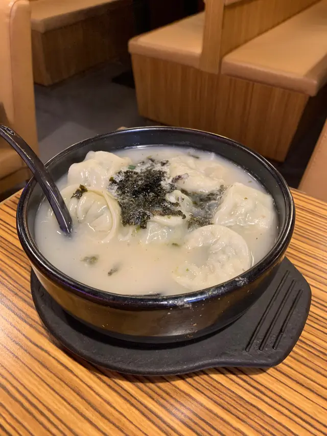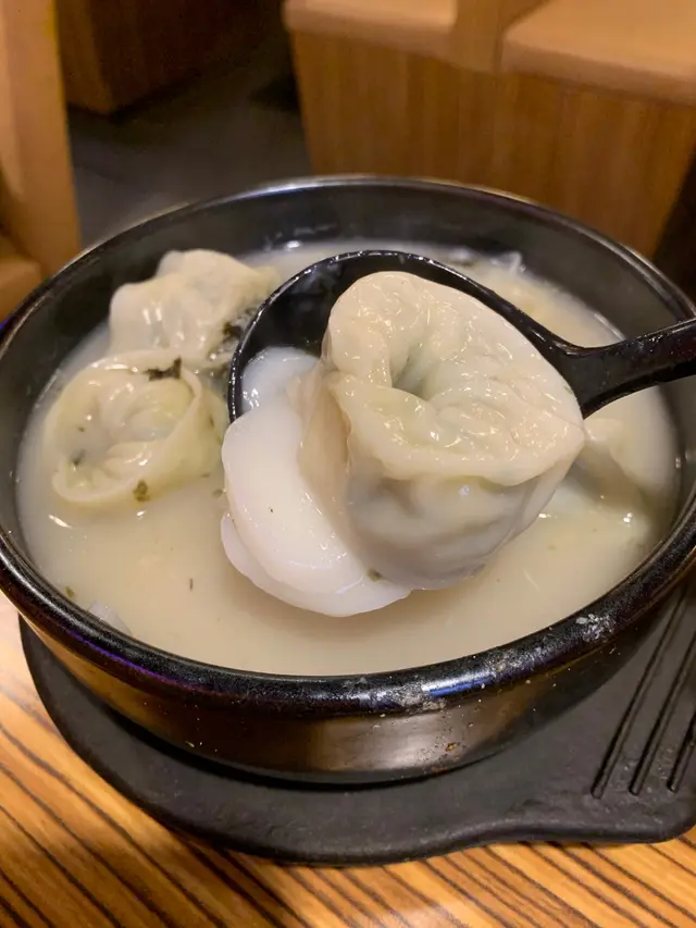 年糕餃子湯:年糕切成片狀,煙韌滑順,餃子以豬肉和青菜做内餡,鮮甜多汁。湯底有點濃稠。