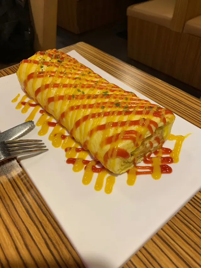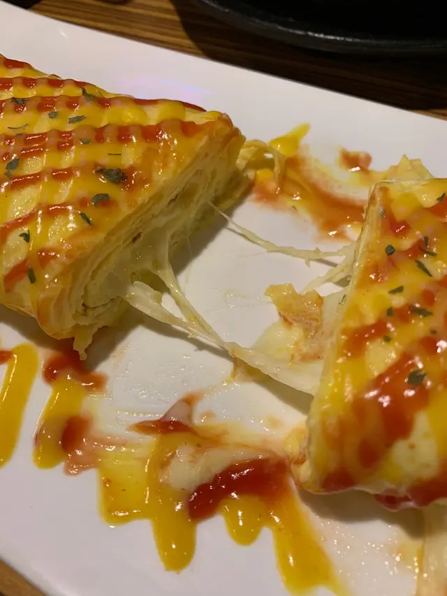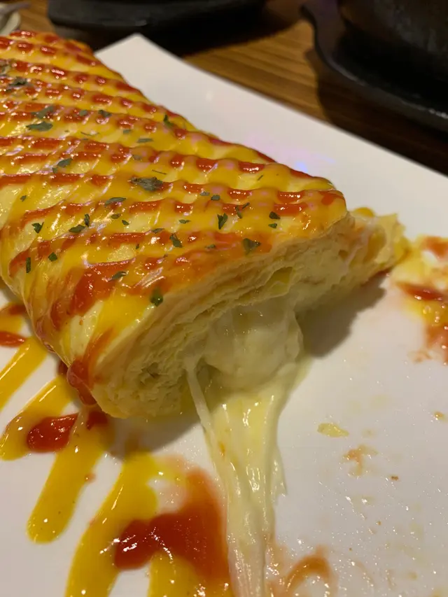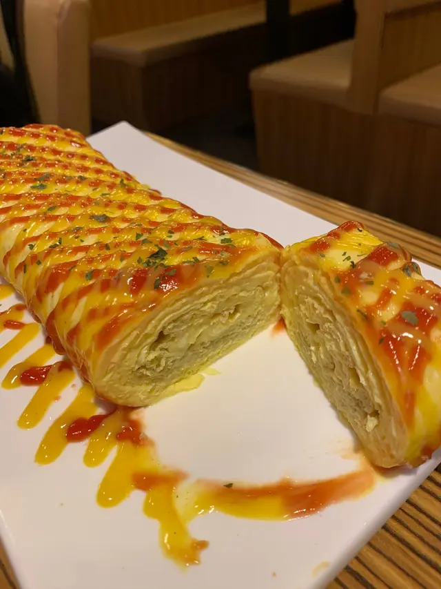 芝士雞蛋卷:熱辣辣的芝士雞蛋卷由一層層的雞蛋卷捲成,很化功夫,內餡是熔化拉絲的芝士流心,蛋味和芝士奶味香濃,完美搭配外層酸甜的茄醬和沙律醬,非常滋味,份量十足。