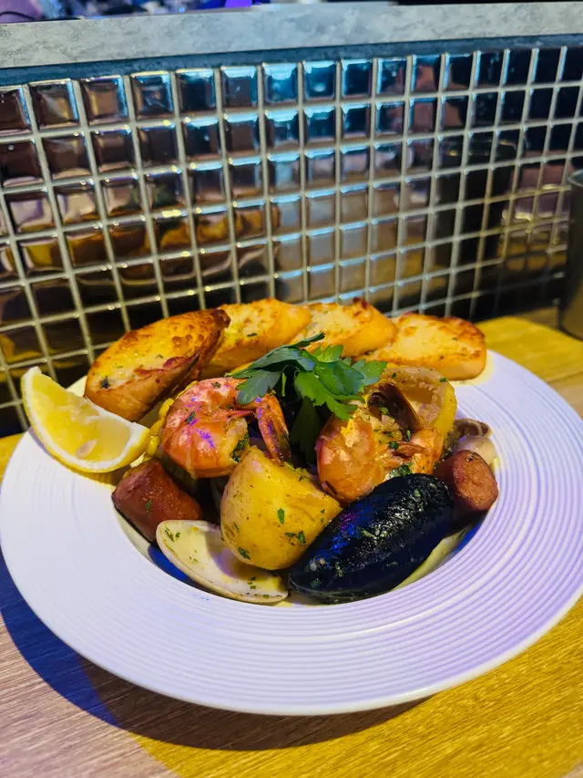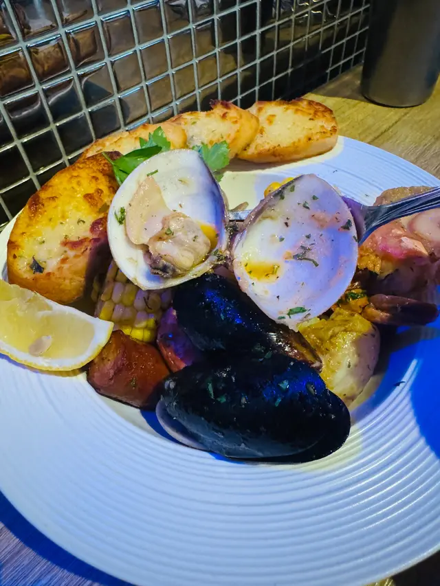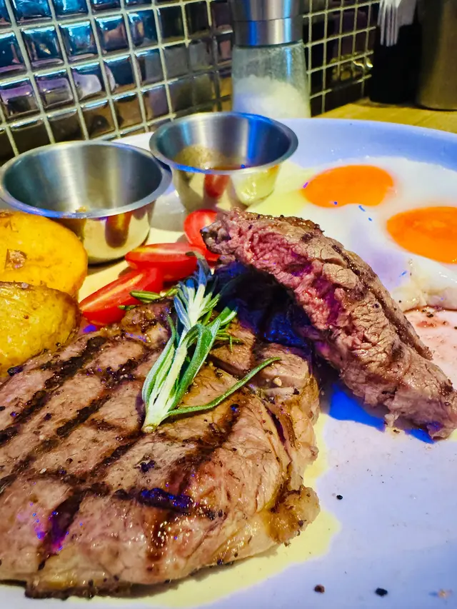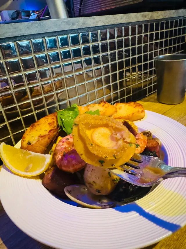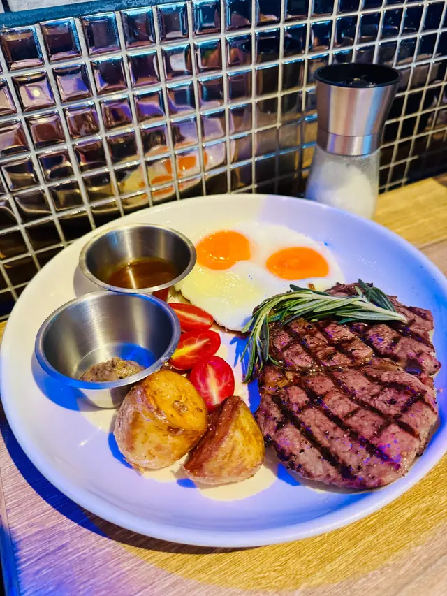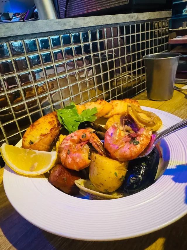 主菜點了海鮮拼盤及澳洲肉眼牛扒配烤薯雙蛋,賣相吸引。海鮮拼盤有鮑魚,蝦,青口,硯,八爪魚,腸仔,薯仔及粟米,配料煎煮後再將檸檬黑椒汁混入海鮮配料中撈勻,味道清新好味。另外網紋煎的肉眼扒煎得剛好,肉質淋身,充滿牛香,不需沾醬汁都已經很夠味道。