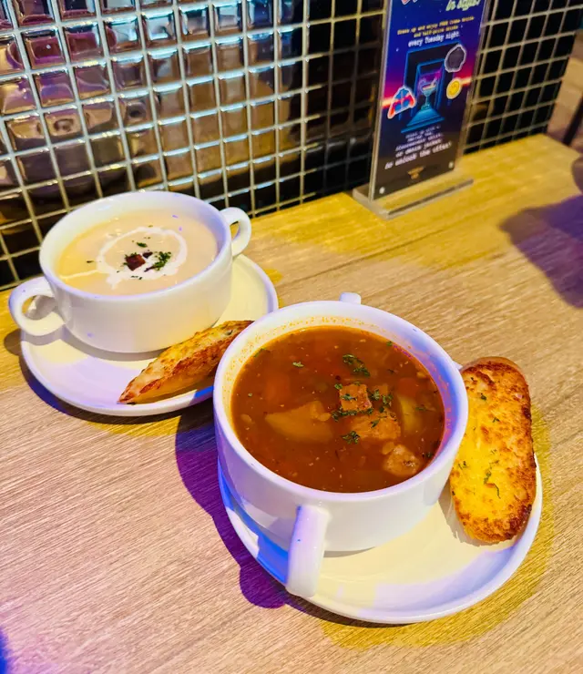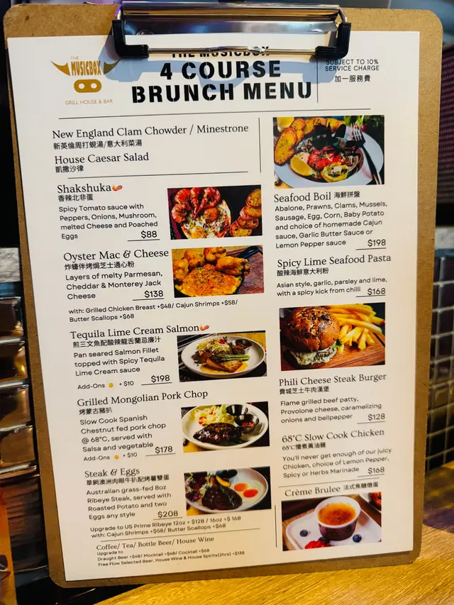 星期六有4個course 的Brunch menu,包餐湯,沙律,主菜,甜品及餐飲,價錢最平$88 都可以了,幾抵食。餐湯是周打硯湯及意大利菜湯,配上一件烘得脆脆的蒜蓉芝士多士。沙律是新鮮的凱撒沙律。