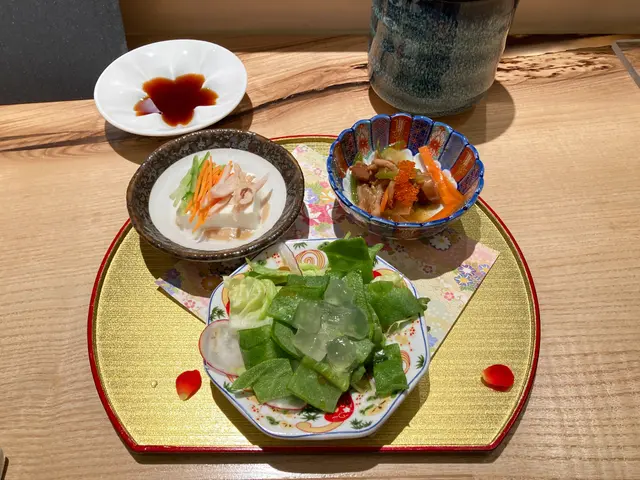 前菜很快就送上來了,一共有三款,分別是沙律、豆腐及赤貝裙邊。