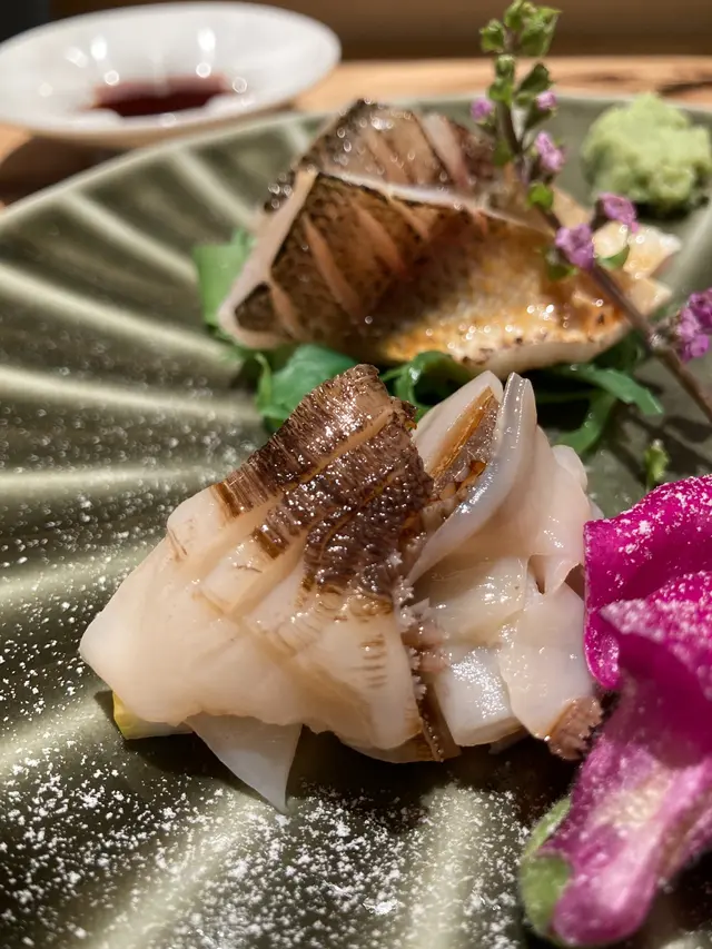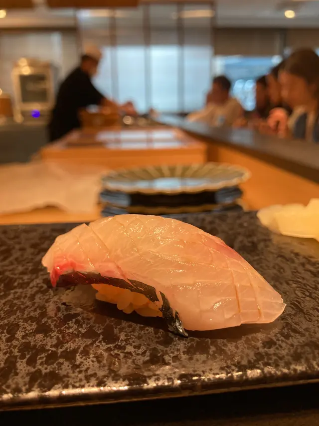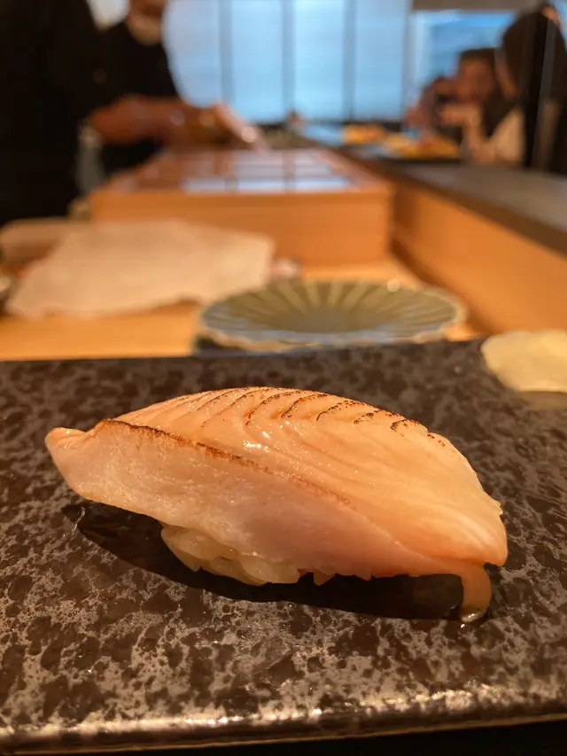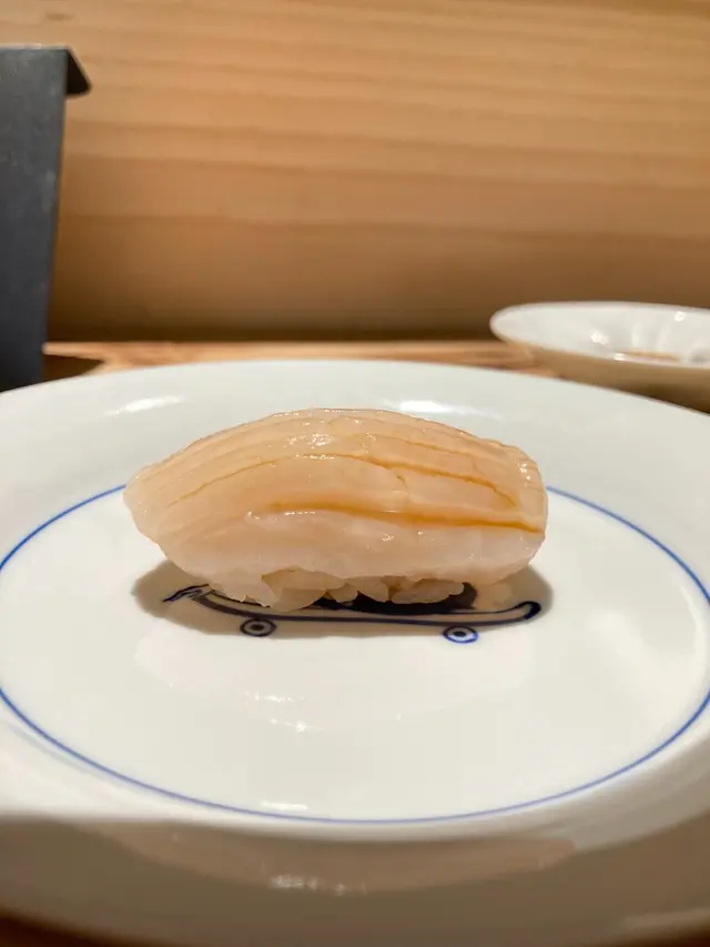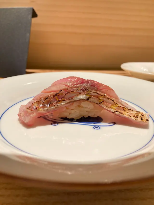 現在很流行的蜜柑鯛,幾乎每一間鮨店都會用上,有三片薄切的魚肉,顏色呈半透明透明狀,魚肉柔軟,但沒什麼突出之處。
