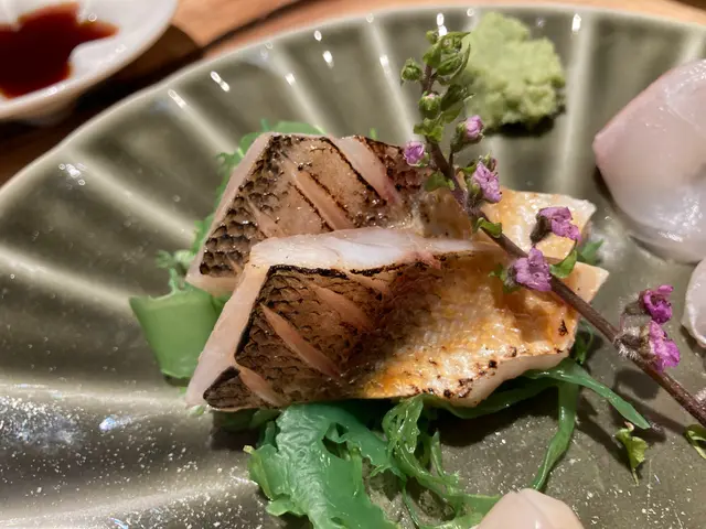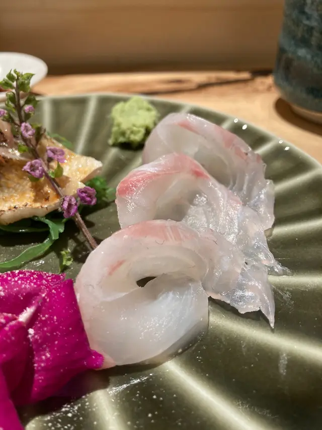 第二件是金線鯛,魚肉肥厚,有清清淡淡的甜味,味道不錯,敗筆之處仍然是因為這件也是炙燒過,但是預先處理好的,所以吃的時候溫度已經太低,失去了魚肉油脂的香氣。