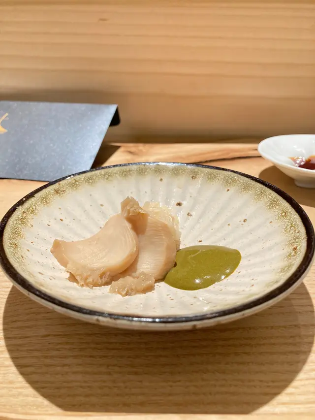 最後的食事是鮑魚乾配壽司飯。鮑魚是溫熱的,十分鮮美,鮑魚肝墨綠色的醬汁配合壽司飯同吃,味道香濃,滿滿都是鮑魚的精華,這款嘅鮑魚肝師傅說用了清酒烹調,有少許酒香味,不錯。