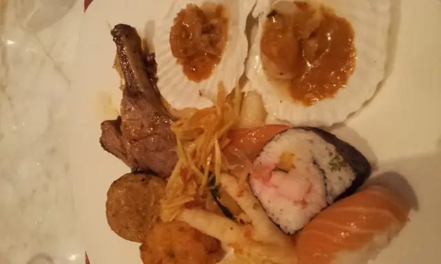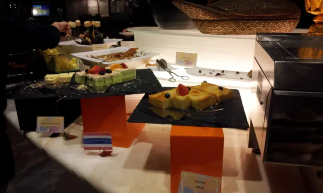 另外燒牛肉,牛味好濃好食;咖哩龍蝦鉗偏咸;長脚蟹味道鮮甜但比較幼;人蔘雞湯好濃,有點中式湯感覺,耶汁雞湯,像唔辣的冬陰功湯,很惹味!有喜歡芝士,燒凡立貝仔比較細粒……差!熱香餅機熱辣辣好好味;仲可以加蜜糖/鮮忌廉/朱古力醬,酒店水準都有保証,唯一唔美滿係好少蛋糕類,反而有部爆谷機……生果亦沒有,雪糕竟然係雀巢……扣分!如果你唔喜歡食cake,又有小童就最適合了!