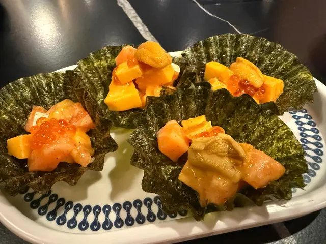 -海膽魚子紫菜杯,一啖一個,海膽同魚子鹹鹹地加上特別醬汁,出奇地好味。