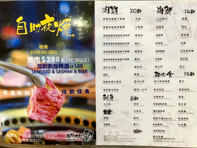 肉類當然也不會少選擇,主打 六款不同部位的安格斯牛及澳牛,包括美國安格斯下肩胛肉、美國安格斯肩胛翼、澳洲穀飼黑安格斯內群肉、澳洲草飼黑安格斯封門柳、澳洲穀飼黑安格斯牛板腱、澳洲草飼黑安格斯牛頸脊。另外有韓式牛肉、韓式牛肋骨、韓式辣豬肉、韓式豬扒、韓式豬頸肉、韓式雞肉、韓式雞軟骨、韓式雞翼、薄切牛脷、霜降一口牛、、五花腩薄切、韓國豬皮、紐西蘭羊肩肉及韓國午餐肉。單是看這陣營也知道不可能吃不飽吧,而且肉類醃得入味可口,燒出來自然十分美味😍