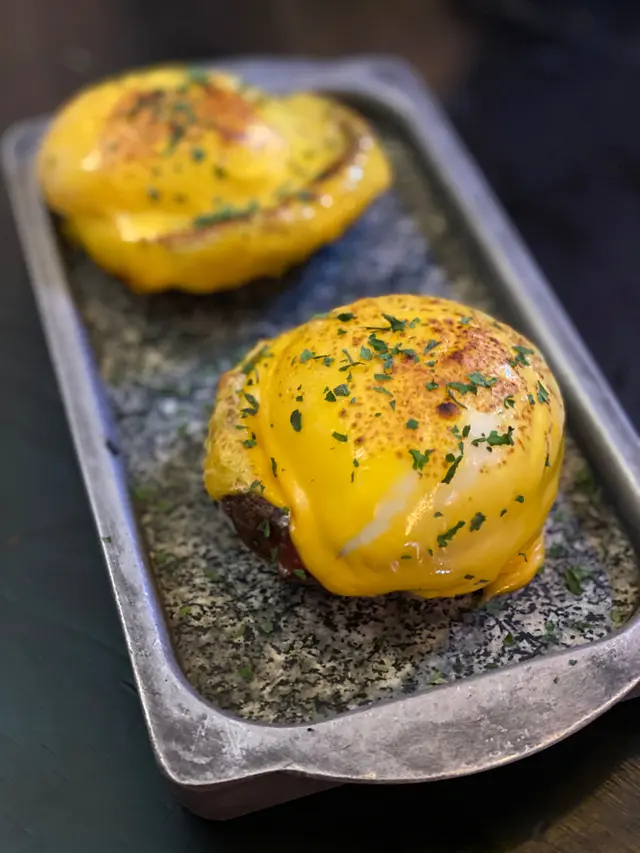 大啡菇上面有隻大温泉蛋,好動L,拮穿隻蛋,蛋黃連埋大啡菇一齊食,非常邪惡,但又好好食😋