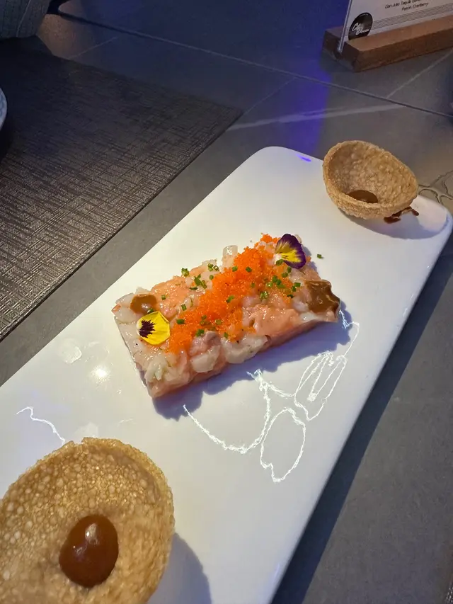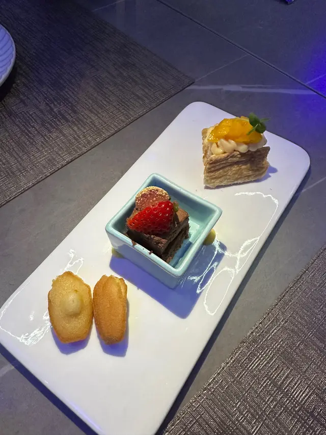 Set dinner前菜我哋揀咗日本帶子三文魚蟹子他他,嗰日嘅餐湯係南瓜湯,main course方面就揀咗香煎加拿大牛柳配和牛頰肉焗薯伴香草紅酒汁,仲包埋個甜品