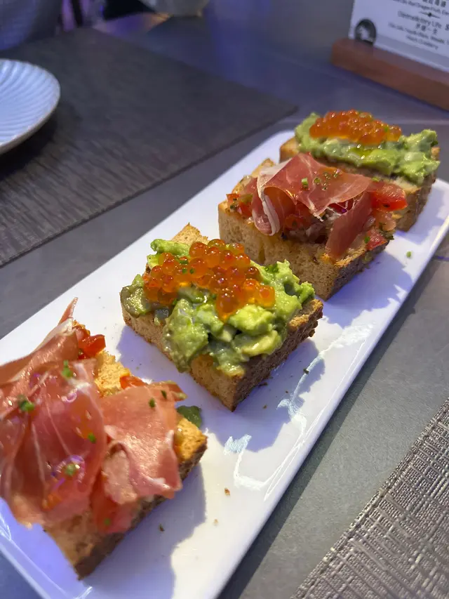 我哋仲散叫咗香煎三文魚配香滑薯蓉伴蟹肉忌廉汁、三文魚子牛油果、西班牙火腿蕃茄莎莎多士 ,各有兩嚿。多士好surprise,牛油果唔會太熟啱啱好,令人一啖接一啖咁食。今餐VIP係三文魚,喺出邊未食過呢隻味嘅蟹肉忌廉汁,好襯三文魚!我同朋友認同會為咗佢而encore。