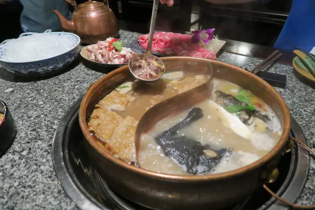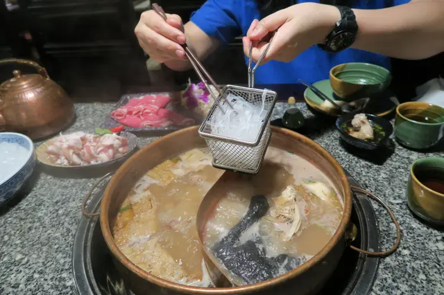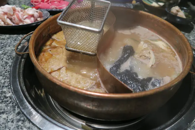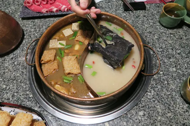這裏的湯底好保身,有6款,由128-168 元不等,可以選擇鴛鴦鍋,會計較高價錢的湯鍋。我和友人揀了秘製薑母鴨鍋拼寧神養心鍋