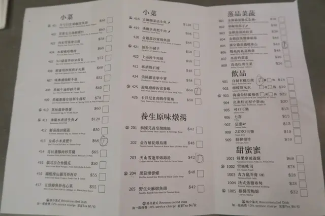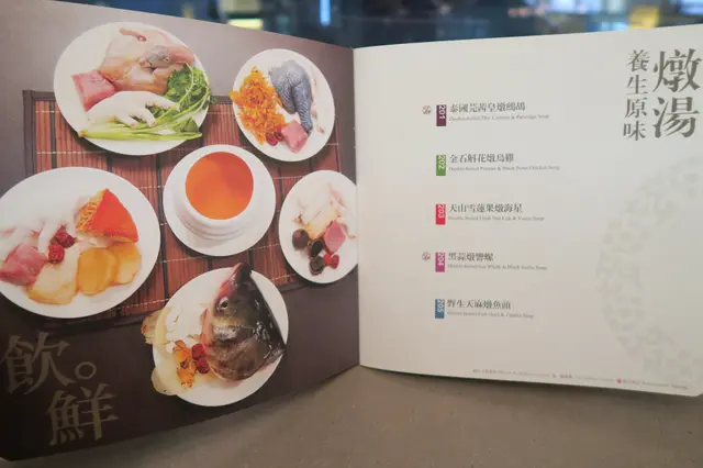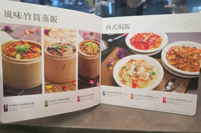餐牌的封面也是有用心設計過,封面是剪出了餐廳的名字跟一些花紋,再用第二頁的色調來為名字跟花紋添加色彩。打開餐牌,是一張張菜式的實物圖,而且是差不多每一道菜都有一張圖片,令菜式名字圖像化,更容易理解一些特別的菜式其中是什麼樣子,再在下單紙上直接點餐跟查看價格。菜式的種類亦多元化,包括了江南小食、點心、小菜、燉湯、蔬菜、風味竹筒蒸飯、西式焗飯、炒粉面飯、飲品跟甜品,對於有選擇困難症的我來說,要選好一會兒才決定好要吃什麼。