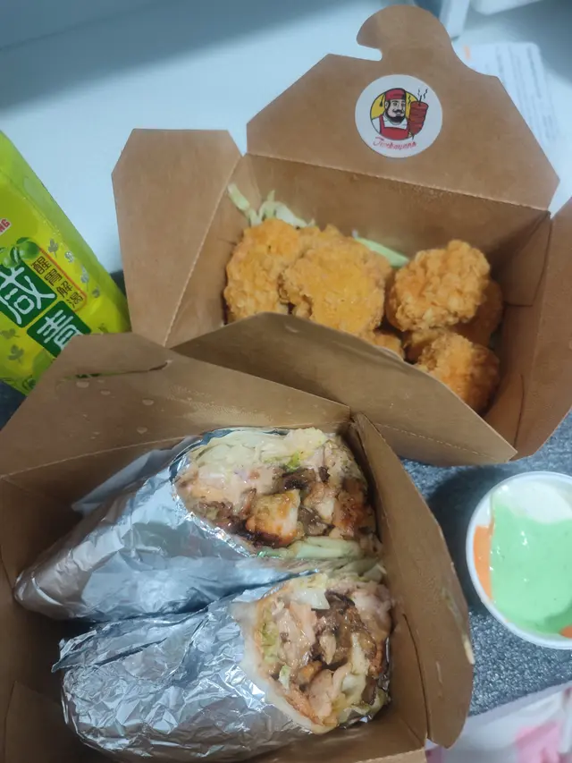 友情提示:一般人(尤其女生)吃一個肉卷已經飽了,再吃點小吃已經撐了。只有像我這種每天健身想增肌又餓了一天才能勉強吃完兩份。你就知道它分量多大用料多足了。