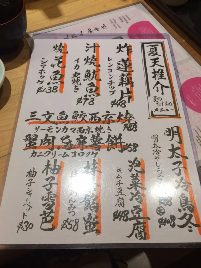 對這家店的印像是麻雀雖小但五臟俱全,全店有一排bar table, 三到四個卡位為四至六人而設,另外還有一到兩張二人抬。我們坐在bar table, 可以望著日本來的師父造壽司,每一刀每一捏都非常純熟專業,附近也坐著不少日本客,聽著師父跟他們談天真的很有趣。餐牌上壽司,刺身,手捲,炸物,串燒都不缺,價錢也合理,由於身體有點狀況所以當天碰巧不可吃刺身,所以就點了一個鰻魚飯,加兩個“夏天推介”小食–燒汁魷魚和蟹肉忌廉薯餅。