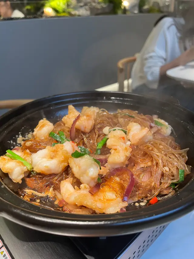 店家會將蒜蓉生蝦同粉絲先放喺煲入邊…再倒入豉油,然後喺食客面前用Gas爐當面煮熟~感覺望落都幾新奇☺️粉絲的份量超多,而且粉絲充滿濃郁嘅洋蔥和醬油味!蝦肉新鮮彈牙有蝦味~而且蝦都幾大隻!非常推薦~