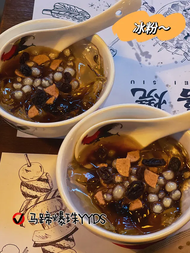 這個冰粉也是一絕,第一次吃到帶馬蹄的爆珠,涼涼滑滑的冰粉加上爽脆的馬蹄爆珠,真的是絕了👍