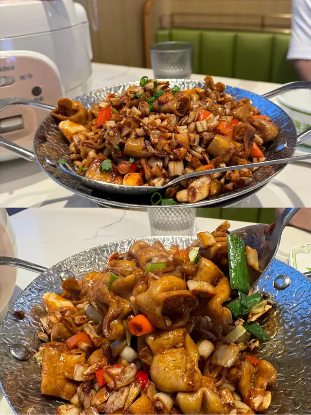 都係爐仔熱住上, 可以自己翻炒; 肥腸份量多, 用蒜頭, 辣椒, 蔥, 薑一齊炒, 味道真係好香。炒到外脆內軟, 再加上有少少肥膏, 煙靭軟糯有咬口, 呢個攞嚟撈白飯真係好正。