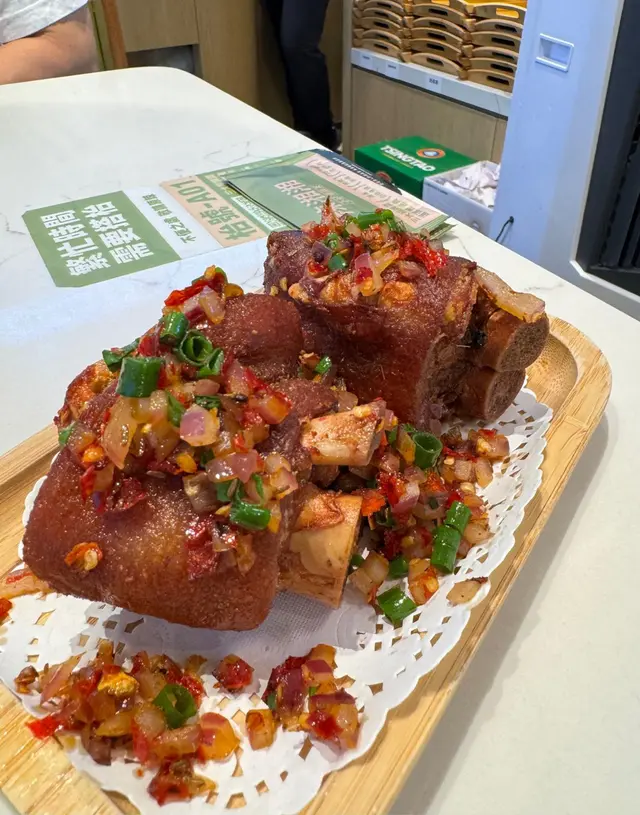 豬手炸到外脆內嫩, 好香脆, 面有好多炒香嘅乾蔥蒜頭料頭, 內裡好多骨膠原, 味道均勻, 香氣十足。