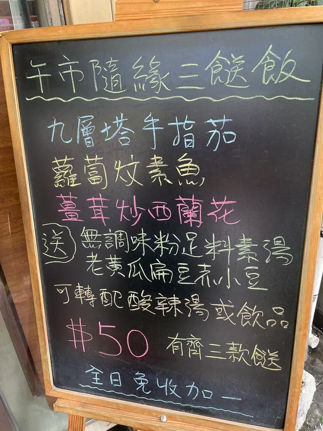 [香港素食] 太子 | 佛手柑素食:午市隨緣三菜飯 HK$50仲有老火湯飲 misskitbLevel 42022-05-162K views Follow 1荔枝角道這間素食店開業了好一陣子,平時食飯時間見都幾多人去食,今次終於有緣食下佢地的隨緣三菜飯。荔枝角道都幾多排隊食店,這間素食店在著名吃扒的西餐廳隔離。平日午市都坐滿人架,不過只有一位店員,需要給點耐性。1餐牌以中式小菜為主,價位都幾平易近人。午市有這個不用揀的廚師發辦三菜組合,五十蚊再送老火湯,外賣加兩蚊。三個菜的份量中規中距,唔係好大手筆果種,吃起來就是正常齋鋪質素,而且非常油膩。老火湯飲落都正路啦,總括來說唔係話會俾你好多驚喜的地方,平日普通醫肚果種地方囉。The above review is the personal opinion of a user which does not represent OpenRice's point of view.1Share[香港素食] 太子 | 佛手柑素食:午市隨緣三菜飯 HK$50仲有老火湯飲 佛手柑素食 https://s.openrice.com/QrKT0AUn200Report Post Ratings3Taste3Decor3Service3Hygiene3ValueDate of Visit2022-05-15Dining MethodDine In
