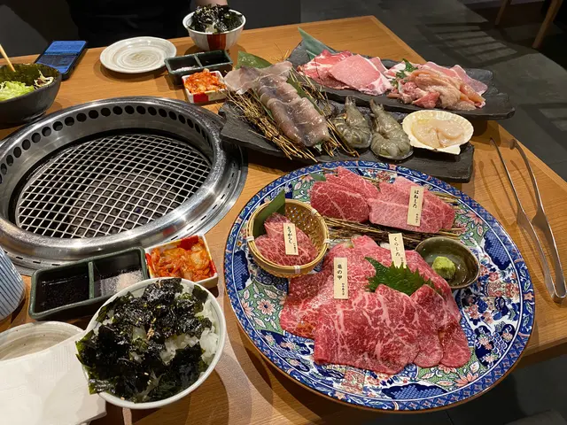 食物好快就上枱,全部擺盤都好靚,每款肉同海鮮得好新鮮。首先食左和牛先,和牛友三角油脂係最豐富,點小小燒肉汁真係一流 牛味極香濃 每一款牛都好好食!🥩