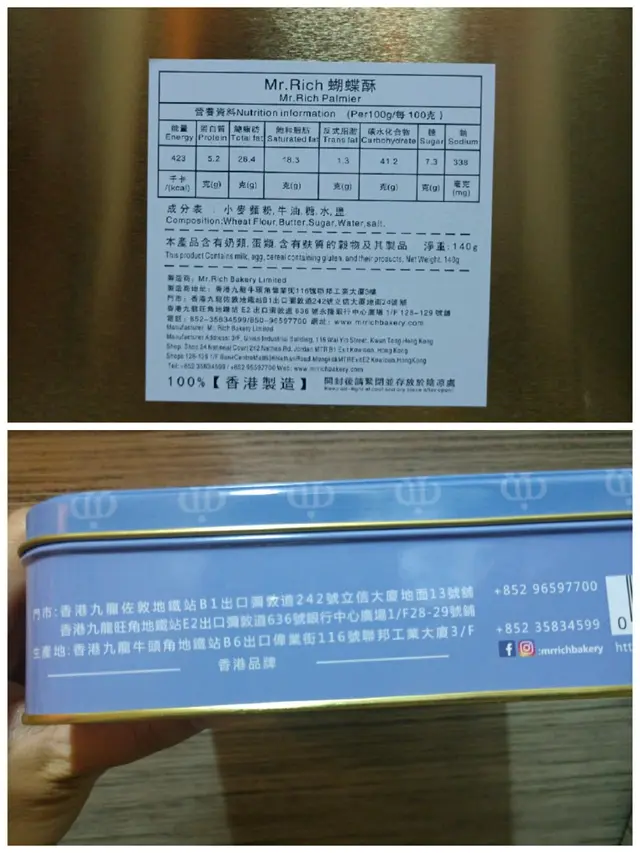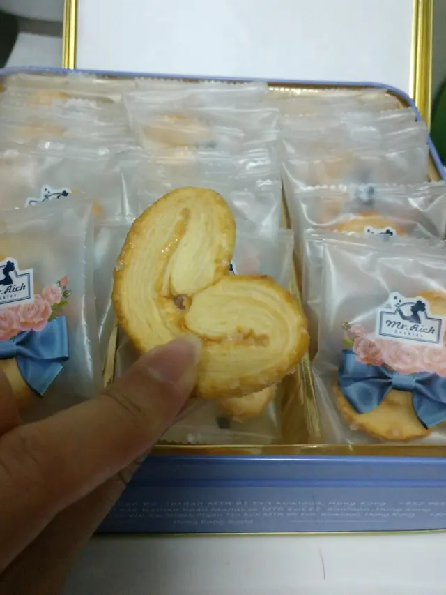 香港製造又一代表作! pigb02Level 42019-07-1547 views Follow 支持香港製造!食曲奇不一定要大牌子。最近爆紅的魔術兔曲奇Mr Rich, 無論包裝設計、曲奇款式、味道,都唔錯喎!我鍾意食蝴蝶酥,今日終於帶左佢返屋企啦! 紫色鐵罐有魔術兔造型,感覺很夢幻,食完留返個鐵罐都開心!100%香港製造,而且不加防腐劑,開盒後要盡快食用,罐底也有寫食用期限。喜歡它包裝設計用心,曲奇和蝴蝶酥的味道都很有誠意。鍾意佢一層一層鬆化嘅酥皮,有少量粗粒砂糖,甜甜地,又有濃濃的牛油香味,鬆化爽脆嘅口感, 一口一塊,吃到停不了,很邪惡啊!獨立包裝,方便隨時吃,一盒有30塊,放在公司下午茶食又得,和同事開心share都不錯!The above review is the personal opinion of a user which does not represent OpenRice's point of view.LikeShare魔術兔曲奇 https://s.openrice.com/QrKT0G1Kr00Report Post Ratings5Taste5Decor5Service5Hygiene5ValueDate of Visit2019-07-15Dining MethodDine InSpending Per Head$108 (Tea)