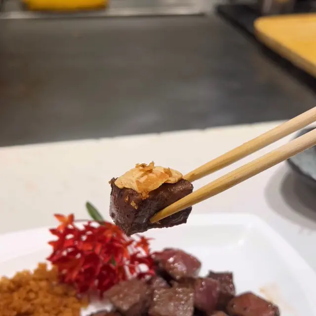 牛柳煎到恰到好處,搭配蒜片超棒的