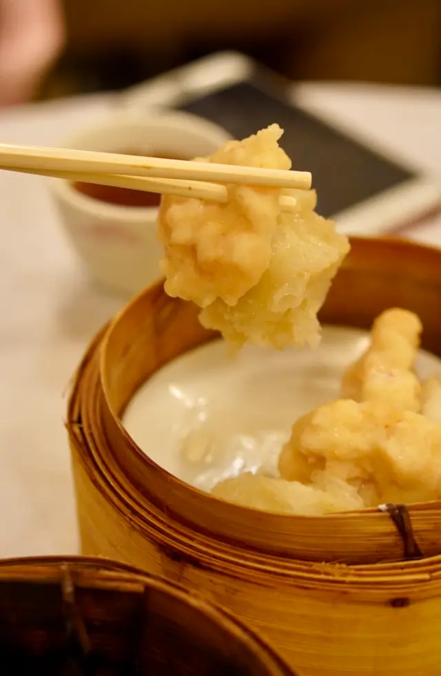 虽不是狂热的虾饺爱好者,但在大大小小的粤菜馆点心店中也吃过不少虾饺了,只是没想到今天这份是个彻底的反面教材。皮子老厚,不仔细看都看不出褶皱,吃起来偏干,不香不油润,还有点粘蒸笼纸。虾仁已经与肉馅融为一体,不仅很小颗,也不是整只的。