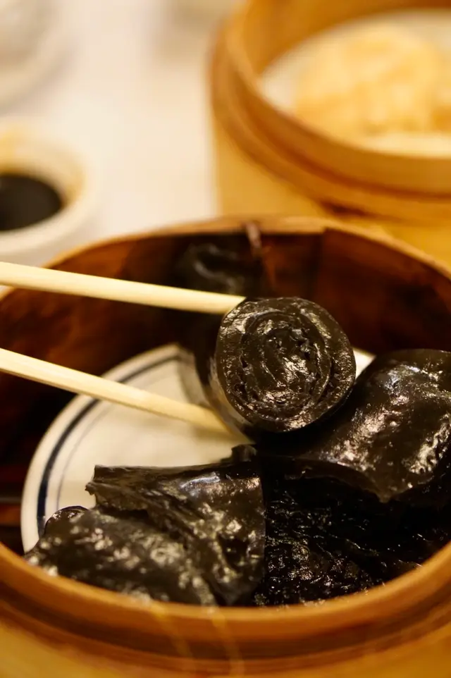 外观光滑乌亮,细腻又糯性十足的口感中蔓延出烘炒过的黑芝麻甘香。甜度克制,可惜做工粗糙,本该是一层层紧紧裹在一起的,但我们这笼揭开盖时已经不争气地“散架”了。