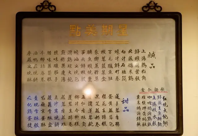 跟茶室往事一样传奇的,是这里的“星期美点”,招牌点心长期保留,其余则是半月一换。咸品20+款,甜品10+款,用工整的红字印在泛黄的点心纸上,古风尚存。虽不及星级餐厅精致,也不是结合名贵食材的创新,但深深吸引我的是它数十年如一日的老派作风,不少老式点心今日已经很难吃到了。