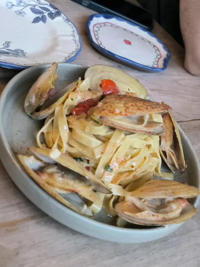 不過輪到啲主角上場,首先個新西蘭大蜆闊條麵,啲蜆大大隻,啖啖肉,好新鮮!曾經聽過老闆兼大廚講佢日日到海鮮檔揀食材,証實並無虛言,啲蜆肉鮮甜到呢....