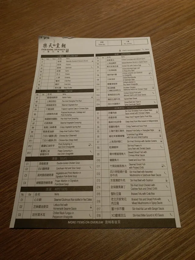 看了一陣餐牌,除了必點的兩款外(皇朝小籠包和松子鮮果桂魚), 更點了一盎清燉雞湯、 乾燒蝦球、 皇朝擔擔麵和鮑魚炒飯,非常期待。