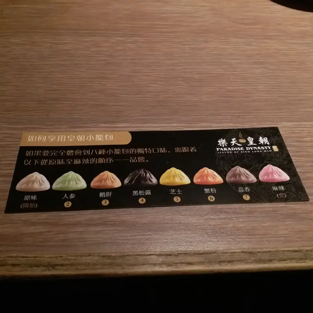 先嚟我至愛的皇朝小籠包, 八種不同味道順序是原味、人蔘、鵝肝 、黑松露、芝士、蟹粉、 蒜香和麻辣, 味道由淺至深,每種味道都口味獨特, 最欣賞這裏的小籠包皮超薄餡靚, 即整即蒸,非常新鮮。