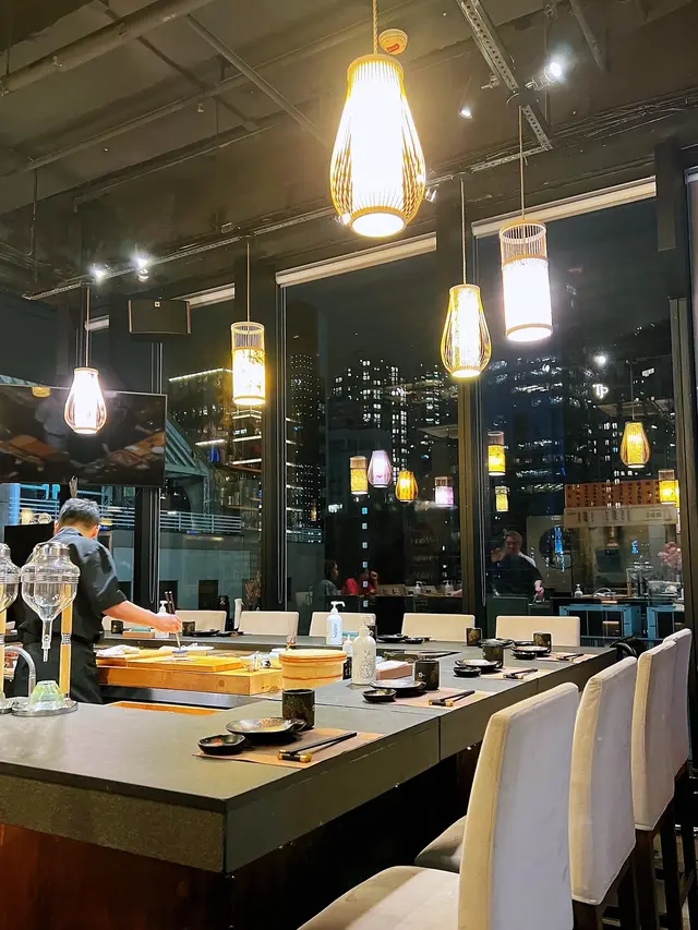 店內樓底高,座位圍繞廚師吧枱為主,能欣賞到師傅們的手藝,感覺寬敞舒適,窗邊能欣賞到高樓美景。