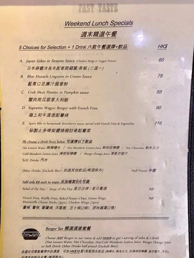 高汁嘅漢堡包意粉小店,今日唔食可能下次食唔到啦~ PigpigzLevel 42020-10-14454 views Follow 呢間黃店小店,有美味嘅漢堡包和自製意粉食。原本業主話0加租,點知上個月被業主個女話加3成租,之後又話要收返間舖,簡直係要趕盡殺絕,咁我一定要嚟食一餐,支持一下💪🏻 店內有紅色石磚牆,木枱,色彩嘅座椅和有趣圖畫。週末去有週末精選午餐餐牌,有5款選擇,包一杯嘢飲,HK$60-$138,都幾抵食。極上和牛漢堡配薯條 (HK$90)食材豐富,有軟滑多汁嘅和牛扒、半溶厚車打芝士、香濃黑松露炒蛋、青脆新鮮生菜、蕃茄和蜜糖芥末醬。厚切薯條炸得香脆,多肉,美味😋極上和牛漢堡配薯條$90極上和牛漢堡配薯條$90熱柑桔檸檬 (HK$0,跟餐送)細杯一點,鮮果味濃但不太甜,不錯。熱柑桔檸檬The above review is the personal opinion of a user which does not represent OpenRice's point of view.LikeShare高汁嘅漢堡包意粉小店,今日唔食可能下次食唔到啦~ Fast Taste (金碧閣) https://s.openrice.com/QrKT0xNmw00Report Post Ratings5Taste4Decor4Service4Hygiene4ValueRecommended Dishes熱柑桔檸檬極上和牛漢堡配薯條$90極上和牛漢堡配薯條$90Date of Visit2020-10-02Dining MethodDine InSpending Per Head$90 (Lunch)