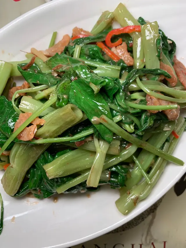 馬拉盞蝦乾炒通菜,鑊氣小炒,上枱時香噴噴,陣陣鹹香令人垂涎,入口香辣惹味,馬拉盞雖然唔係咩矜貴野,但呢個平民菜式卻可以牢牢咁鎖住老老嫩嫩嘅胃。