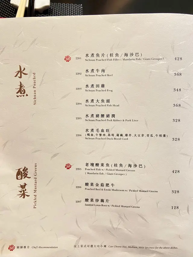 話明川菜就緊系以辣野為主,講到主菜,第一頁已經系水煮菜式,見到都覺得辣呀🥵仲有近年好興嘅酸菜魚~多數比較多人都系北上食,喺香港好似吾多地方有。