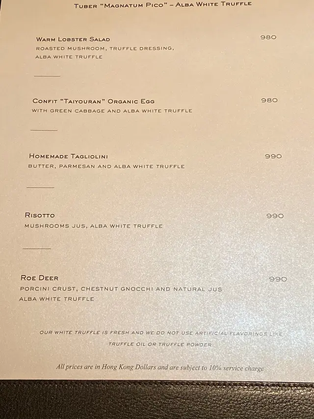 期間限定的白松露餐牌選了香港少見的鹿肉。鹿肉烹調得宜肉質嫩滑。意大利直送白松露會在上菜時現磨,香味俱全但配上濃侑的醬汁味道較難突顯,宜少沾醬汁。栗子Gnocchi很好,配上栗子片跟鹿肉白松露都很配,就是份量太少。