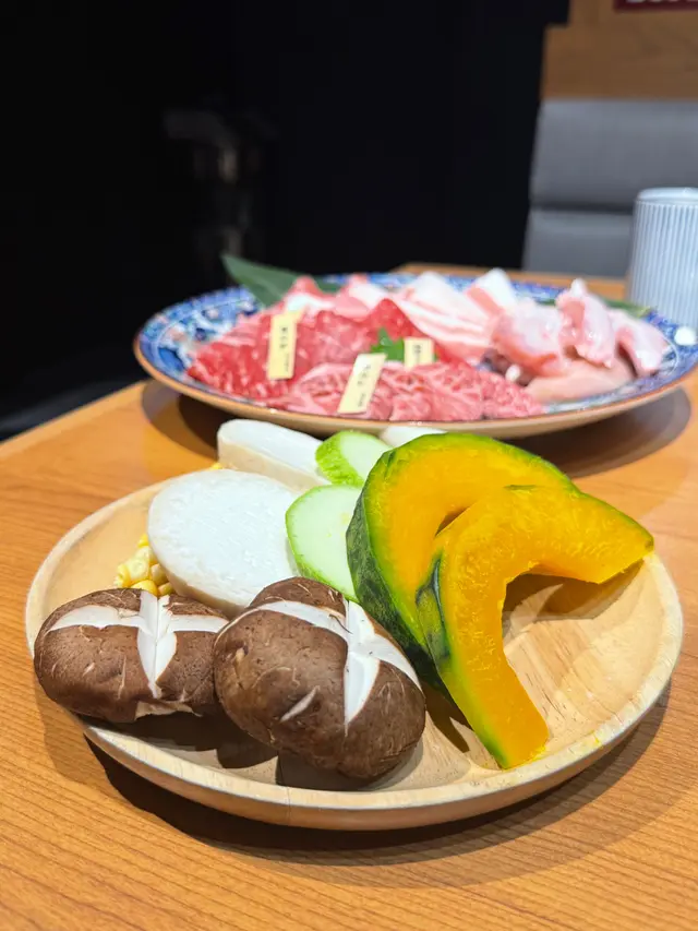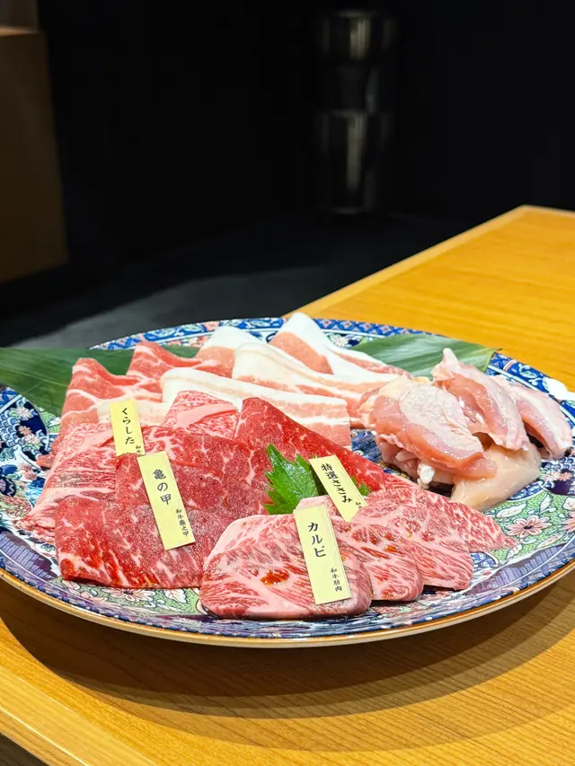 嚴選A5和牛肋肉油脂豐腴,龜之甲部位彈牙有嚼勁,豚肉肥瘦相間,燒肉點埋醬汁,味道一流。