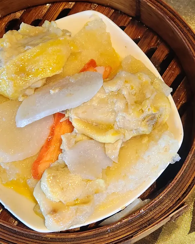 食完個香口嘅沙律卷,係時候清淡返少少。大件超滑蒸雞肉加巨無霸級大片魚肚墊底(鋪滿晒成個碟!)足料到爆!