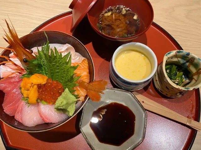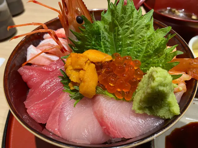 等左唔使5分鐘,我叫嘅海鮮丼定食終於到啦,賣相好靚,顏色又豐富。海鮮丼有8種新鮮嘅魚生,分別有鯛魚,油甘魚,三文魚,吞拿魚,三文魚籽,海膽,牡丹蝦等等,真係數都數唔晒。全部魚生都係厚切,色澤光亮,非常新鮮,而且肉質鮮甜美味,貴少少果然係唔同食法。