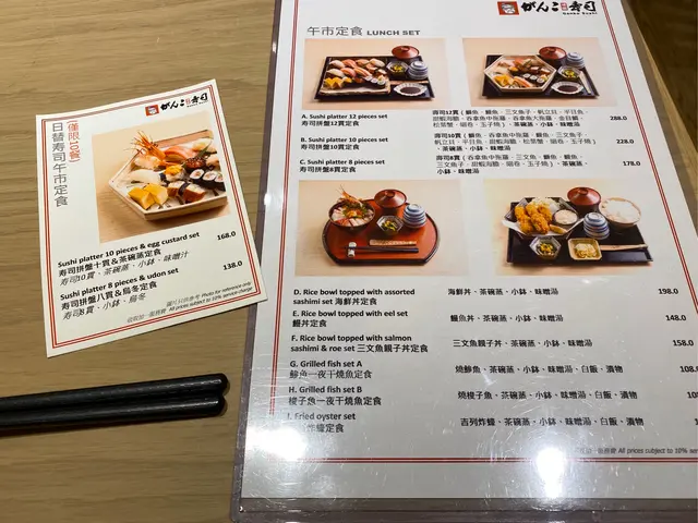 午市定食餐牌,睇落款款都好吸引,所有選擇困難症都出黎呀。最後決定左要海鮮丼同壽司12貫。相比起日本店,價位算中上,但係店員指出所有刺身都係每日由飛機直送,而且喺尖沙咀黃金地段,難怪一分錢一分貨。
