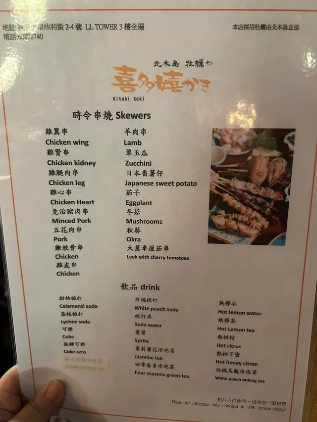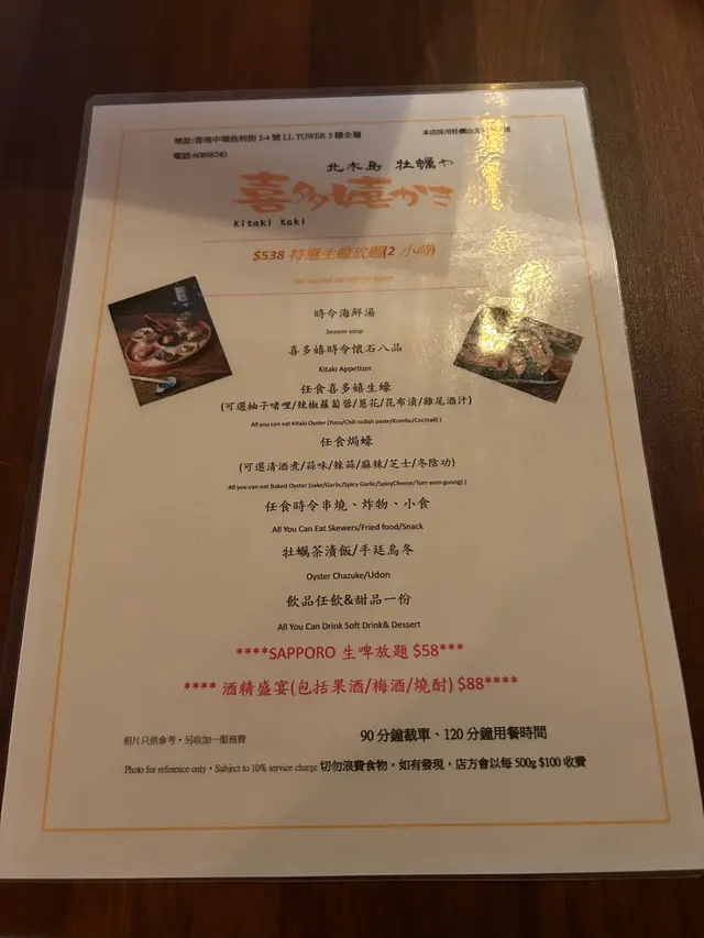 包括時令海鮮湯、喜多嬉時令懷石八品、任食喜多嬉生蠔、任食焗蠔、任食時令串燒、炸物、小食、牡蠣茶漬飯/手廷烏冬,飲品任飲同甜品一份;有120分鐘用餐時間,90分鐘截單