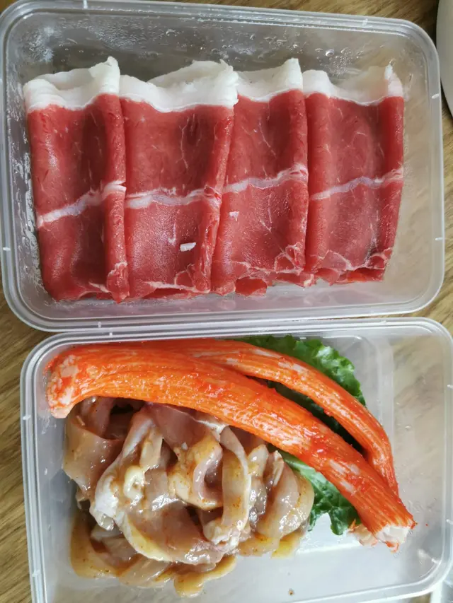 火鍋配料有肉質幼嫩的牛肉(或者豬/羊肉) ,配雞肉、大大條8寸蟹棒~