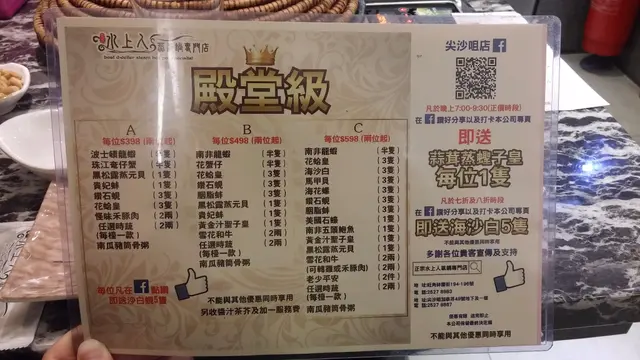 職員貼心的奉上熱茶和餐牌。餐牌上有海鮮餐﹑散點海鮮和小菜可選。我倆為海鮮而來,便點了較多海鮮款式的B餐 ($498/ 位)。熱心的職員還提醒我們,只要Like & Share Facebook,更可額外多送每位沙白5隻呢~!