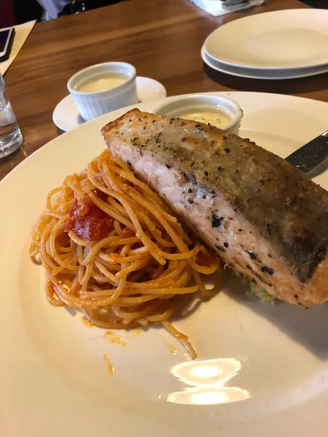 三文魚扒配意粉方面,魚扒煎得幾好食,對比起pizza亦相對健康