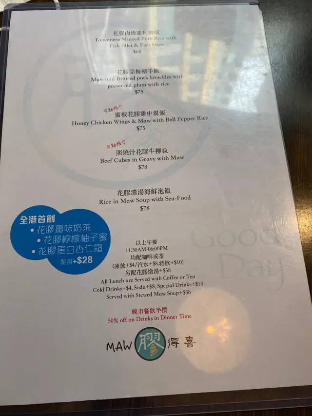 星期六放工之後就去左佐敦撐枱腳,試左依間做花膠料理嘅餐廳,本身對花膠冇乜興趣,不過見呢間裝修幾靚,所以試吓,依間嘅午市都幾抵食,我地點左個花膠話梅豬手飯,依個飯就有幾塊花膠,我地再點左個花膠肉燥龍利柳飯,但依個飯嘅花膠就同啲肉燥融為一體,變左一粒粒,整體都幾好食,同埋幾飽肚,跟餐有湯又有野飲,湯係普通例湯,比較特別係叫左個花膠檸檬柚子蜜,其實個味係普通檸檬柚子蜜,因為花膠本身都冇味嘅,都係貪過癮先試吓啫。