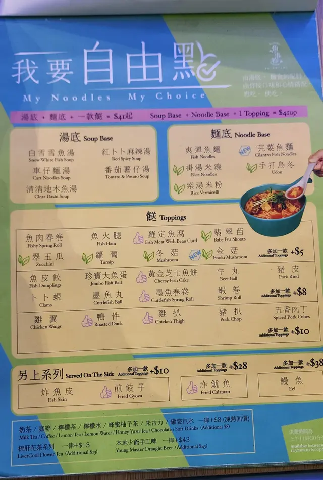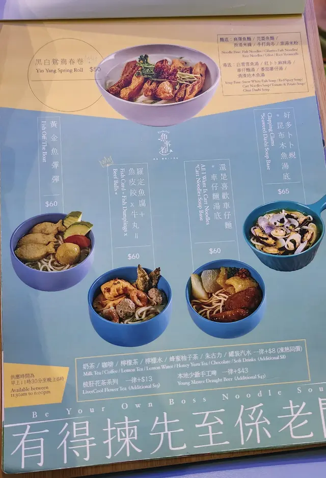 店舖面積唔太大,糖果色調為主,感覺舒適,接近下午茶時間,人客唔太多,餐牌配搭多樣化,以魚麵為主軸,亦可以揀烏冬、米粉、米線,中西式都有,另外可以加配小食同飲品,點主食,配飲品仲有優惠😄,侍應細心解說餐牌,要先俾讚👍