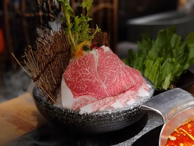奉上後可見食材後方放置有少量幼小樹枝、蔬菜、乾冰作為點綴裝飾,隨後職員便將水份倒至乾冰之處,從而使其產生煙霧,如此富有心思的菜餚甚是適合打卡拍照。而和牛肩胛肉質擁有均勻雪花,入口柔嫩細膩,濃郁即化。