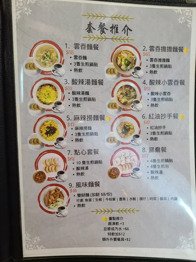 餐牌:上海點心如鍋貼、生煎包、小籠包及葱油餅,酸辣湯,麵點,風味小食。都有套餐。精選推介,飲品等。